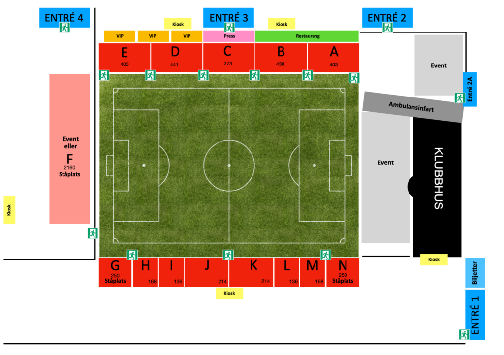 Bortasektion: Sektion F ståplats (entré 4). Samtliga köpta sittplatser på gamla läktaren kommer att flyttas till sketion D på nya läktaren (entré 2).kortsidan Vid större följen öppnas ytterligare sektioner.